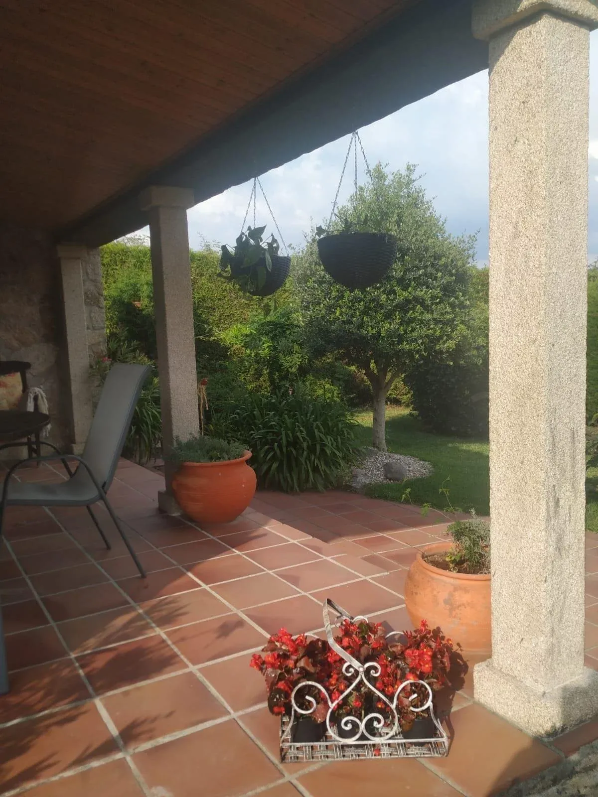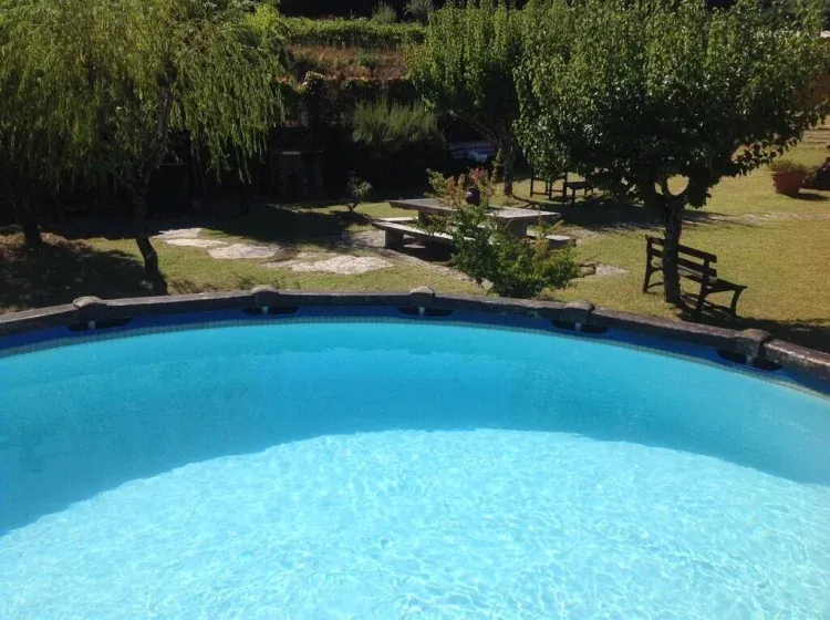 En la zona exterior encontrarás un porche que cuenta con mesa y sillas de teka dónde desayunar, comer o cenar al aire libre, todos los huéspedes destacan esta parte de la casa que invita a largas sobremesas. un jardín con zona de barbacoa, aparcamiento, una terraza, piscina de superficie con escalera que podrás retirar para cuidado de los peques, estanque con nenúfares y peces de colores que travesarás sobre un puente de madera. El jardín está repleto de plantas y flores de colores además de árboles.