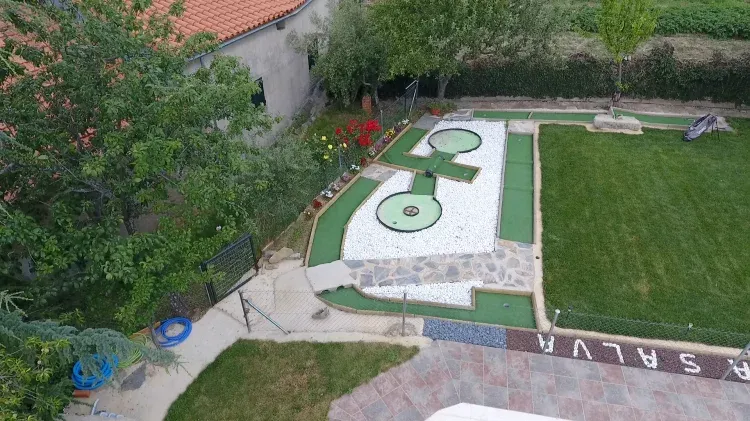 - zonas exteriores: jardín, piscina privada, barbacoa y zona de recreo para los más pequeños con columpios y minigolf.