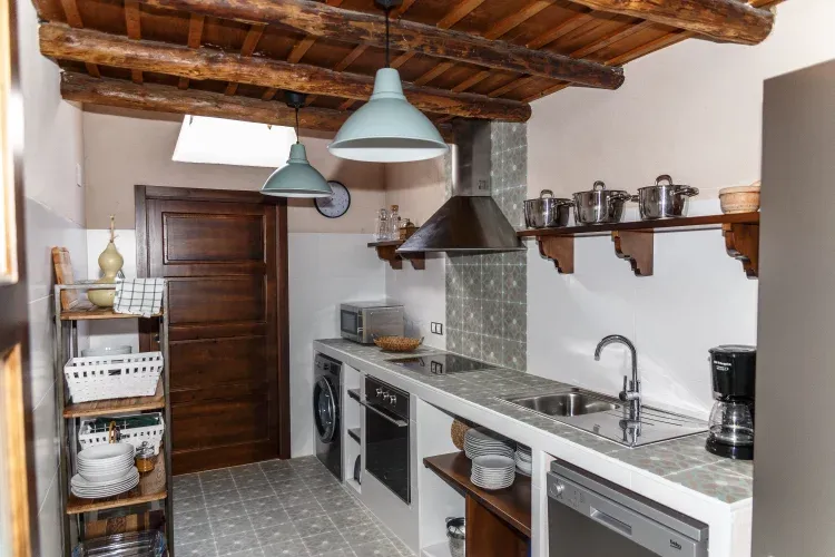 La cocina está totalmente equipada y dispone de vitrocerámica de inducción, horno, lavadora, lavavajillas, microondas, batidora, cafetera italiana y tipo melita, cacerolas y sartenes de distintos tamaños, fuentes para el horno, tostadora y olla exprés. Dispone de utensilios básicos (vajilla y cubertería completa), copas de vino, vasos de cóctel y mantelería. Cuenta con plancha, tendedero y tabla de planchar.