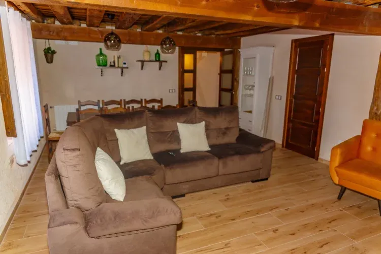 El salón-comedor cuenta con estufa de leña, televisión de 49", mesa y sillas de enea, taburetes, vitrina, amplio sofá rinconera y sillones individuales, y dos ventanales con vistas a la zona del arroyo y el prado. Tiene una pequeña biblioteca de literatura histórica y cultural del entorno y juegos colectivos (ajedrez, parchís, oca) para los mayores y juegos infantiles (cuentos, bolos, pinturas) para los más pequeños.