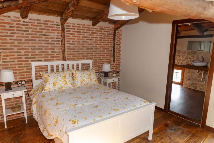 La habitación de la planta baja incluye cama de forja (135x190), silla, mesillas y lámpara, galán y armario; ventanas con cortinas de lino que dan al patio de la vivienda y otra al exterior, con vistas al prado; cuarto de baño completo, con lavabo, inodoro y bañera con asas de seguridad.