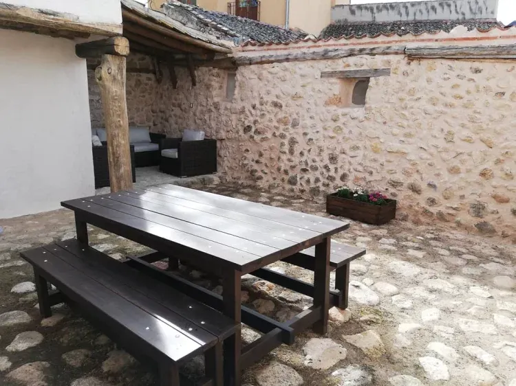 El patio de 45 m2 de superficie cuenta con barbacoa, mesa y bancos de madera, y sofá y sillones en el porche, así como iluminación artificial para disfrutar de largas veladas nocturnas.