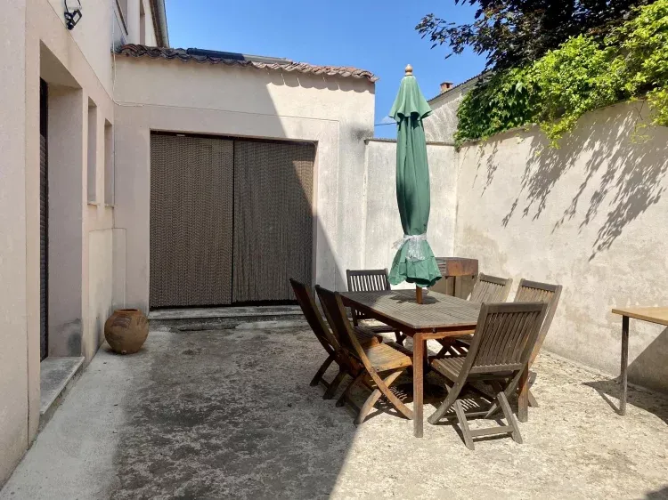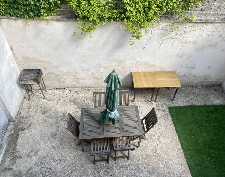 Desde el salón podemos acceder al patio donde tenemos una barbacoa y una zona de mesas.