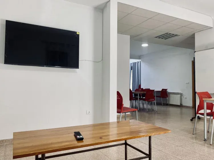 En la primera encontramos un salón-comedor con espacios muy amplios y diferenciados, una zona de sofás y TV y otra zona de comedor con mesas, la cocina totalmente equipada para su uso con todo lo necesario, como lavavajillas, microondas, horno, congelador y nevera industrial.