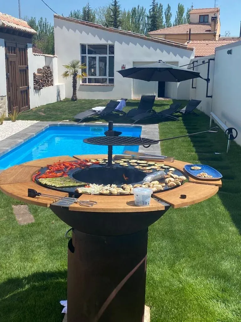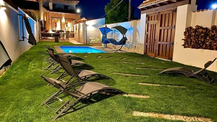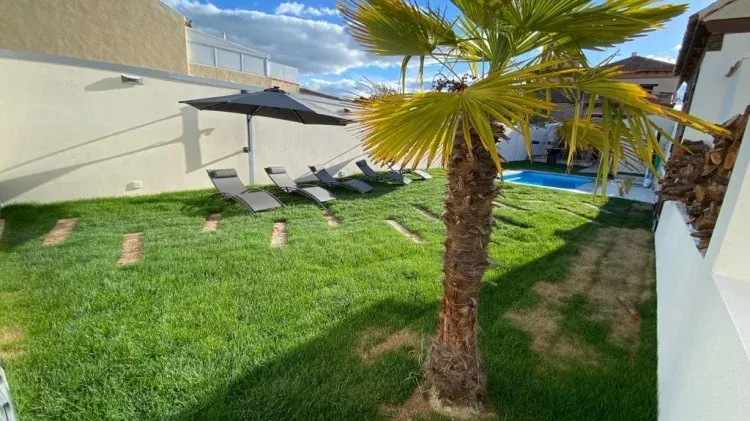 Jardín con piscina, porche y barbacoa, dispone de mobiliario de jardín (sillas, mesas, tumbonas, balancines, sombrillas y chimenea exterior). También hay sala de juegos con tv, futbolín, ping pong, mesa de hockey , y juegos varios.