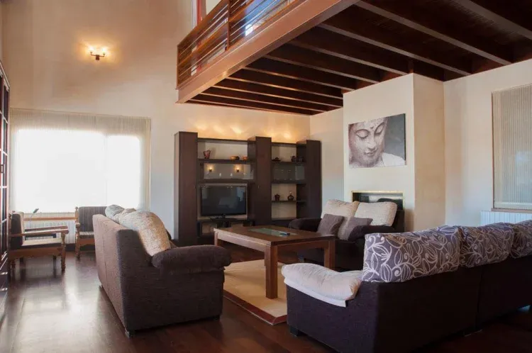 El salón es diáfano con estudio arriba, cuenta con TV de plasma y rincón de lectura, así como sofás y butacas suficientes para el total de plazas de la casa.