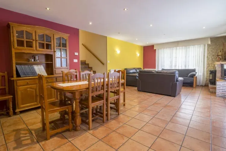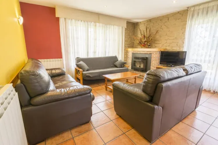 La capacidad es de 6 plazas, distribuidas en tres habitaciones con dos baños completos con secador de pelo. El salón comedor súper grande con chimenea y piedra caravista en dos de sus paredes, cuenta con dos juegos de sofás, uno de ellos cama.