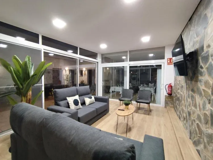 Hay dos cocinas, una de ellas junto a un comedor amplio para todo el grupo y otra en una salita de estar con sofá y televisor. También dispone de un salón con sofás y televisión.