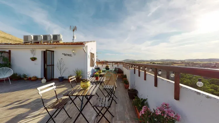 • Apartamento con terraza: Apartamento estudio en una tercera planta sin ascensor. Consta de un espacio con pequeña zona de estar, cocina, cama y un baño. Además tiene una terraza de 90m2 con unas vistas espectaculares a los molinos y al pueblo.