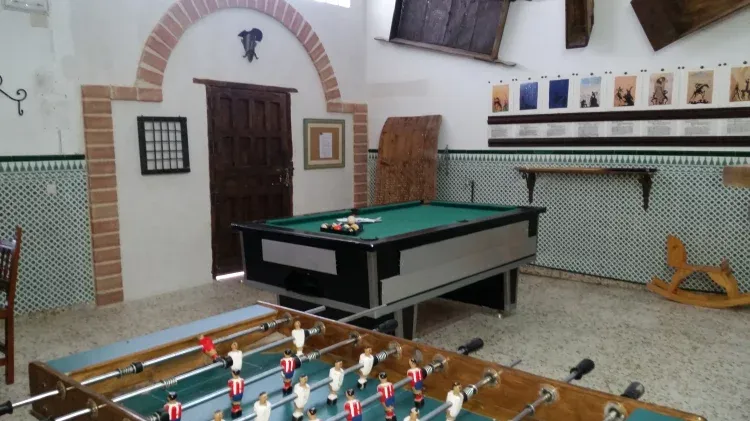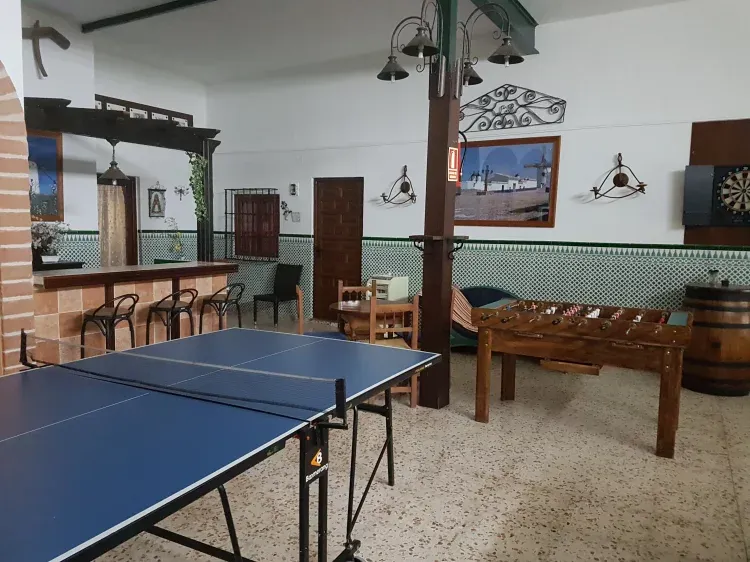 Salón de juegos con billar, futbolín, mesa de ping-pong, barra de bar, etc.