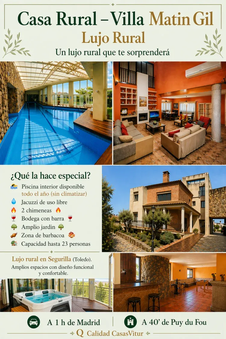 Villa Martín Gil destaca como una de las opciones más completas dentro de la oferta de alojamientos rurales en la provincia de Toledo. Su excelente relación calidad-precio, su carácter exclusivo y su gran capacidad la convierten en el lugar ideal para grupos numerosos. La vivienda cuenta con hasta 23 plazas distribuidas en 8 habitaciones, adaptándose perfectamente a familias con niños, grupos de amigos o reuniones de varias parejas.