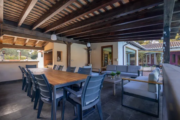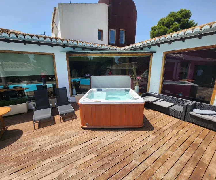 Tiene una espectacular piscina, sauna, jacuzzi, bar con grifo de cerveza, barbacoa, parking cubierto, amplio porche cubierto, tarima de madera alrededor de la piscina, edificio auxiliar de juegos con billar, ping pong, futbolín, televisión, proyector y pantalla, 8 bicicletas. Orientación perfecta de manera que ningún vecino puede ver el interior de la parcela ni piscina o la terraza.