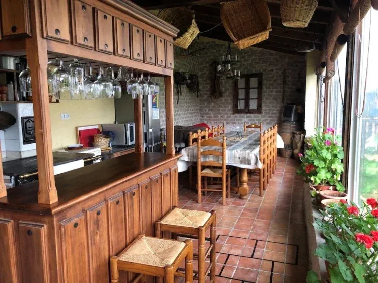 Anexo a la vivienda y accediendo desde el patio se encuentra el Merendero, dispone de un baño con ducha, está equipado con cocina económica de leña, donde se pueden hacer asados y guisos a la antigua usanza, dispone de un mueble bar rústico, y mesa para 14 comensales con la posibilidad de ampliarla hasta 24 comensales.