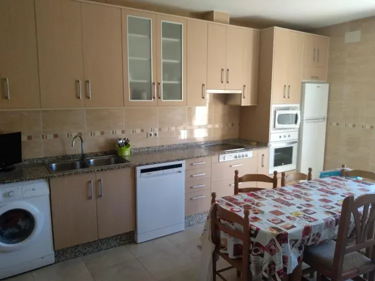 Totalmente equipada con menaje completo, platos. batidora, secador pelo, cubiertos, cazuelas, sartenes olla presión, cafetera, tostadora, plancha, tabla planchar. etc.